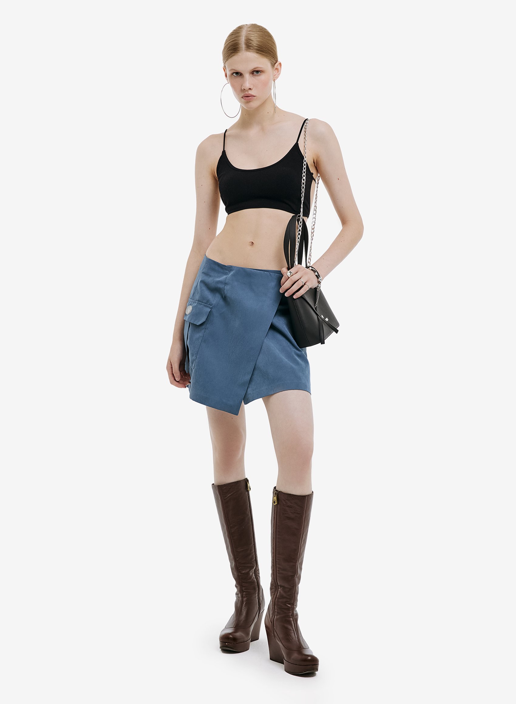 Мини-юбка на запах из коллекции TRACK. Накладные карманы по бокам. Брендирование — ПВХ шеврон. С запахом, на пуговице и удобными накладными карманами.